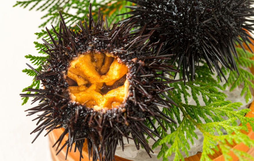 オオバフンウニ科に属するウニで大型種。 ウニは冷水性(バフンウニ)に対して本種は温水性を好む。味は良いが流通量は少ない。分布 本邦では日本海側は秋田以南。太平洋側では茨城以南から沖縄に生息。浅瀬に棲む。 主産地は三重・兵庫・徳島各県で地域消費。特徴 殻径10㎝。殻高5㎝。棘は黒色に紫色を帯びているのでこの名がある。旬は3月~5月。