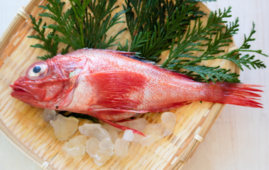 昔は庶民が口にするが、今は高級魚。寒帯域の魚で日本海には生息しない。カサゴ科の海産硬骨魚。分布 本州中部以北から北海道沖合、水深300~600mに多く棲む。特徴 カサゴ科特有で頭・口が大きく、細長で側扁し、体色は綺麗な赤色、最大体長30㎝。卵胎生で冬~初夏に胎児を持つ。冬期は脂肪に富み、肝は別格。旬は11月~3月。※1960年(昭和35年)頃まで主に練り製品(蒲鉾材料)