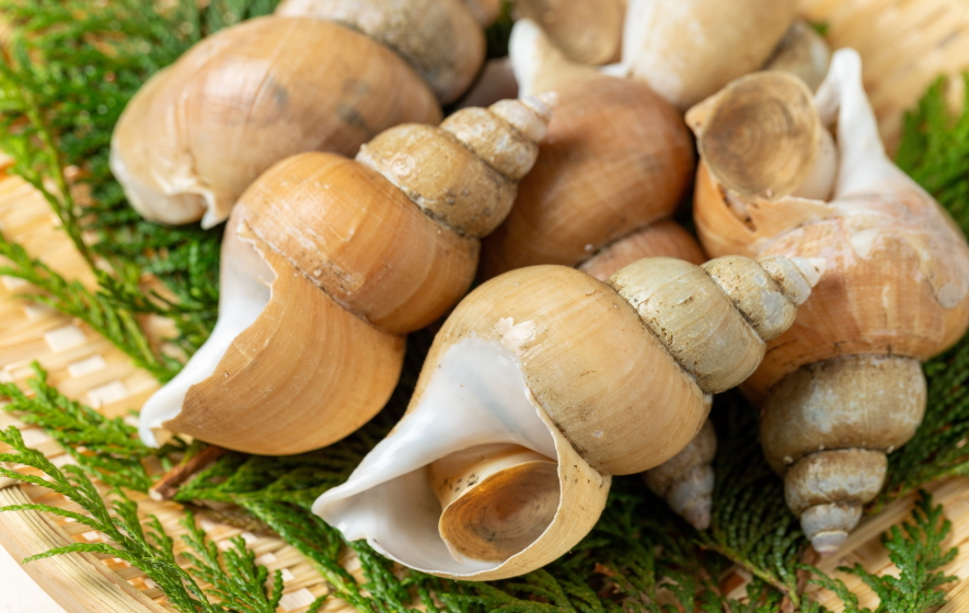 エゾバイ科に属する巻貝。分布 日本海で北海道から山陰地方。主産地は新潟・石川各県で水深100~200mの砂泥底に生息。特徴 殻長12㎝、殻径7㎝で殻は薄く壊れやすい。美味な貝。軟らかく生食、煮貝にする。旬は10月~2月。