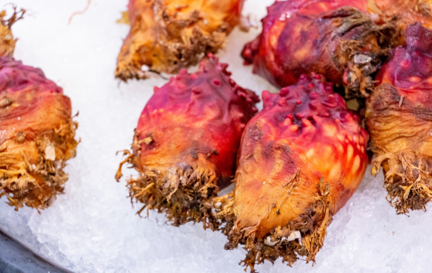 尾索 動物間に属する海産動物。「保夜」は古より食用。文献では『 類聚 雑要抄』1115年 台盤 料理の献立に記載。歴史の中で忘れ去られ、昭和の初め再認識される。分布 太平洋側では牡鹿半島以北、日本海側では男鹿半島以北より北海道。水深30m以浅に生息。特徴 体型は楕円形。全身が厚い殻皮。 疣 状の突起入水孔「 + 」と出水孔「 - 」がある。体長15㎝、幅10㎝。雌雄同体で産卵は秋~冬で出荷まで3年~4年要する。旬は5月~8月。