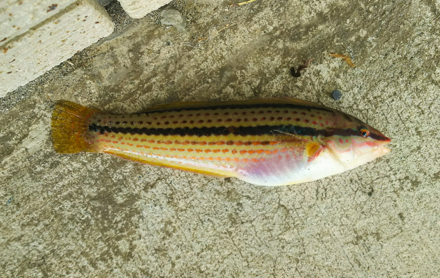 特徴 細長く側扁し、小さい時はメスで、体色は赤黄色で体側中央に黒色の縦線があり、背の方には赤色の点状縦列があり、大きくなるとオスに性転換し、体色は青緑色に変化する。メスもオスも美しい魚体である。