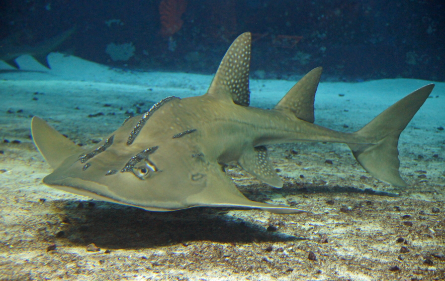 特徴 体はサメに似ているが、エラ孔が下面にあってサメとエイの中間のような外見である。体色は背が赤味を帯びた褐色で、腹は黄褐色。最大体長1mに達する。卵胎生で6月頃20㎝ほどの胎児7~8尾産む。
