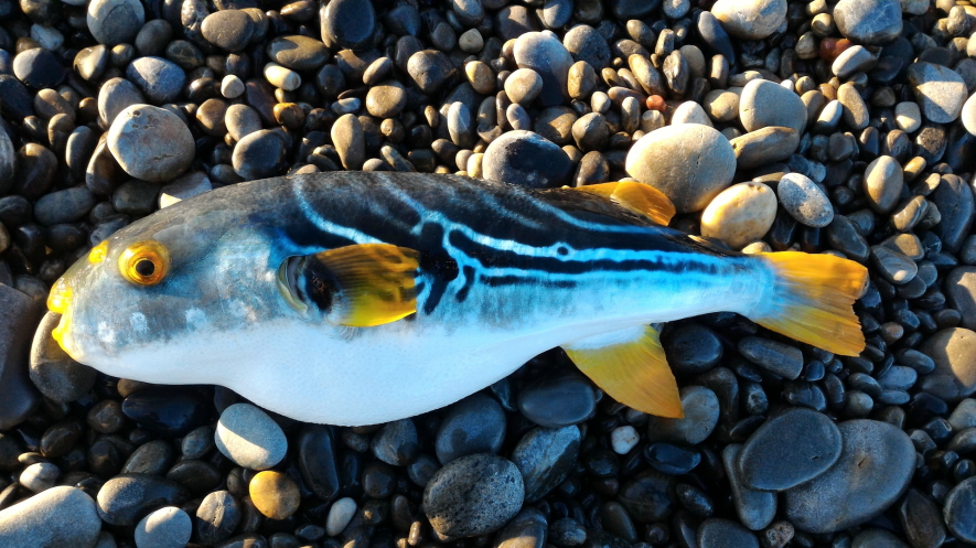 特徴 背、腹に小棘が密生している。体色 背の方と側面は紺色の地色に背の方から体側後方に向って白い縞が斜走する。各ヒレは黄色。