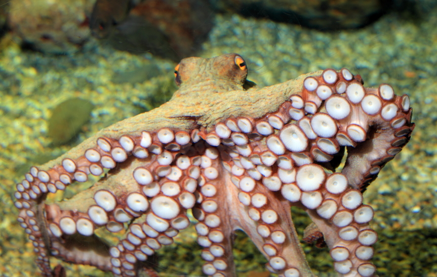 タコは海産軟体動物で夜行性、カニ、エビなど好む。餌を巣穴や手近な穴で食べる習性を利用して蛸ツボ漁をする。蛸の体型は頭部が胴であり、目のあたりが頭部、足は腕部である。体色、環境に応じて体色が変る保護色で擬態をする。なかなかの知恵もので、実証実験で知能の高さは証明済である。