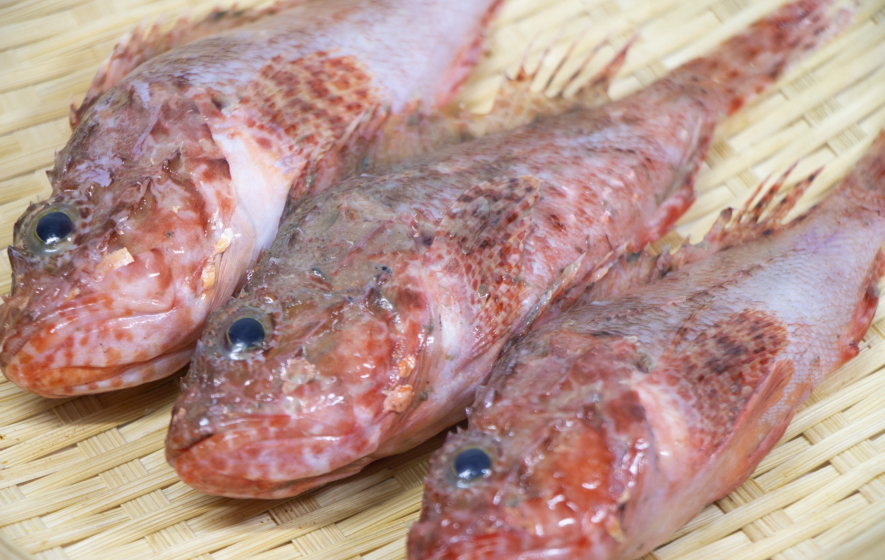 特徴 笠子に似て大きな頭部に沢山の棘があり、口が大きい。体型は長楕円形で側扁し、胸 鰭 ・背鰭・尾鰭に濃い赤色の斑点が散在する。体色は赤色。最大体長は40㎝に達する。上身は白身で上品。身筋は硬く美味、五法の調理に対応出来る食材。