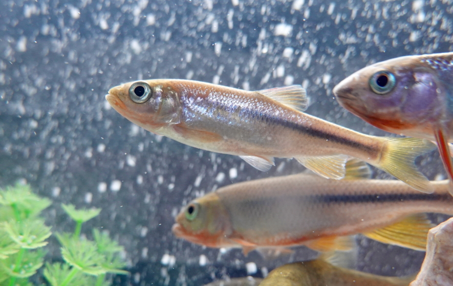 特徴 体は側扁し、吻先は丸みを帯び、尻 ( びれ ) が大きく一見オイカワに似ているが、体側に藍色の縦縞が1本あるので見分けることが出来る。体色は背面が褐色か黄褐色で腹部は白っぽい。最大体長15㎝。