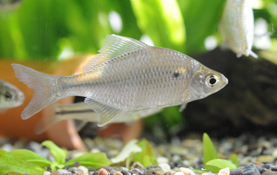 特徴 タナゴ類の中で最も体高が低く、口角に一対の口ヒゲがある。体色は銀色、背部には青緑色の斑紋がある。体長6~10㎝。産卵期は4~6月でカラス貝やトブ貝など大きな二枚貝に卵を産む。