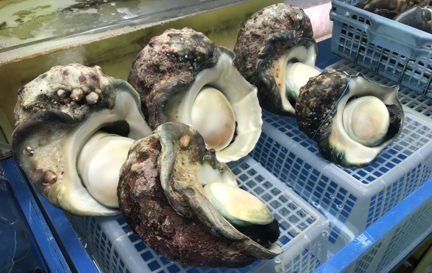 特徴 殻表は暗緑色。最大殻高・殻径共に20㎝(2㎏位)の大型貝。肩の太い肋がある。夜光貝とあるが暗闇で螢光することはない。繁殖活動は冬場を除き、年中で雌は緑色の卵子を雄は白い精子を放出する。稚貝は3年で7㎝と成長は遅い。