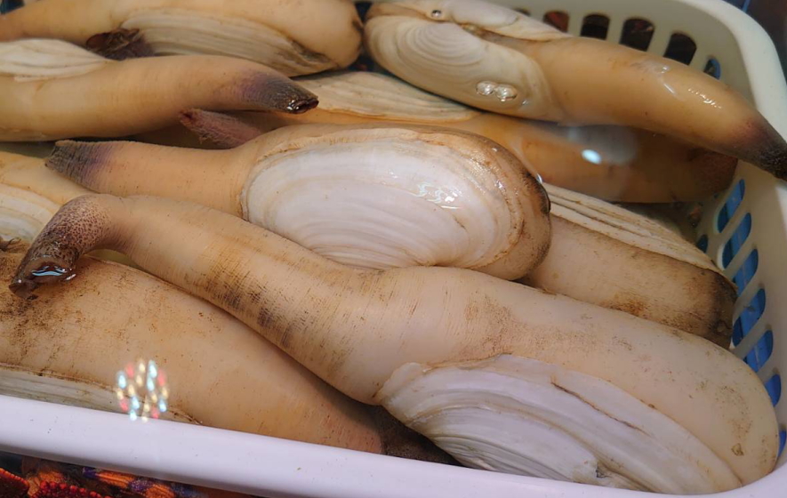 殻長10㎝、殻高7㎝、水管15から20㎝と長い。旬は3月より6月頃で美味な貝である。可食部分は水管。