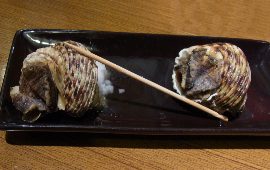 特徴 殻高8㎝、殻径6.5㎝に成長し、サザエに似ているが殻表に強い肋が走り、 角 (突起)がない。