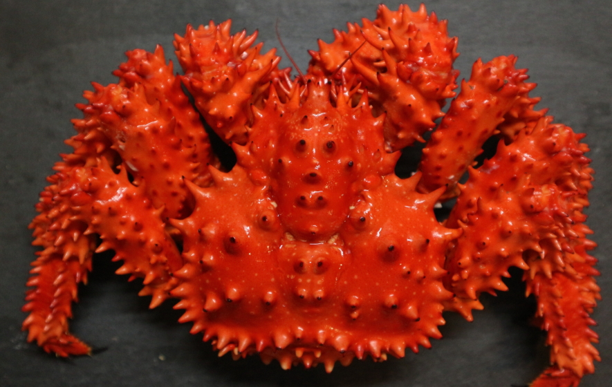 特徴 甲羅・ 鋏脚 ・歩脚に鋭い突起で覆われ三対で太く短い雌の腹部が右側に捻れ、左側だけに腹脚がある。体色は活の時は暗赤紫色で、茹でると鮮やかな赤色。