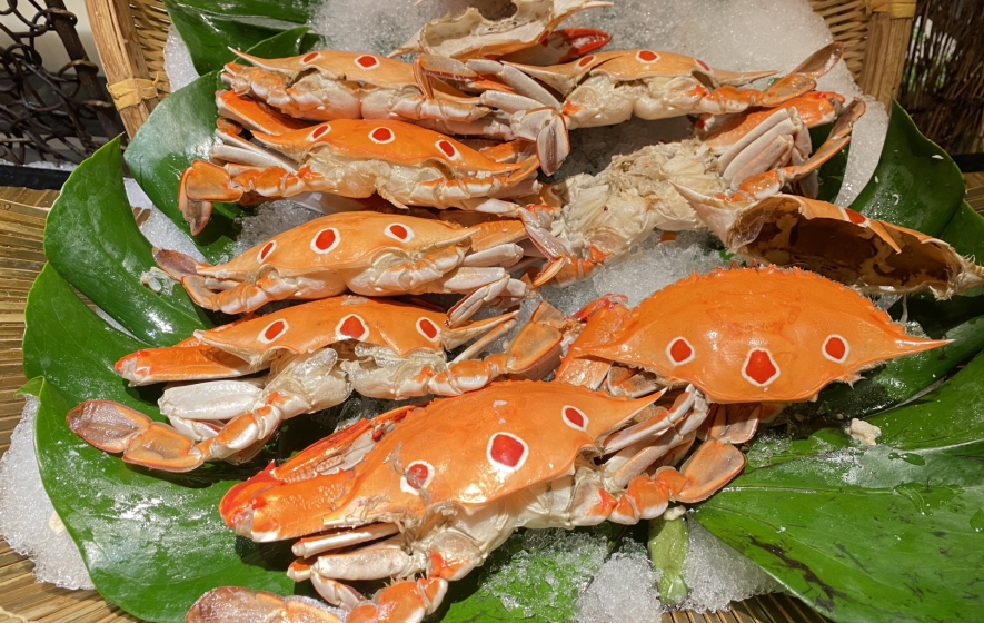 ワタリガニ科に属するカニの一種で甲羅に3つの紫黒色の円紋がある。