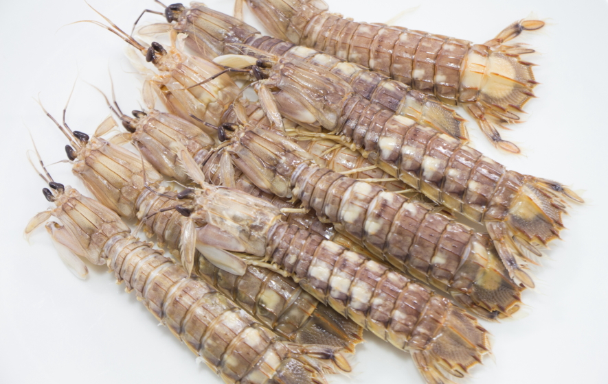 特徴 体は細長く腹部は扁平し、辺縁は短い棘があり尾扇を持ち、体色は淡緑色か灰褐色で茹でると淡小豆色になる。体長は15㎝に達する。雌の方が高価で見分け方は頭部と胴体の間に3本の白い線あるのが雌で、雄にはない。産卵は5月から7月中旬で産卵数は4~5万粒と多くこの期間が最も美味。雄の活用は活を真っ直ぐのばし急速冷凍にしたシャコルイベは最上の一品で極上の味。旬は4月より7月中旬。