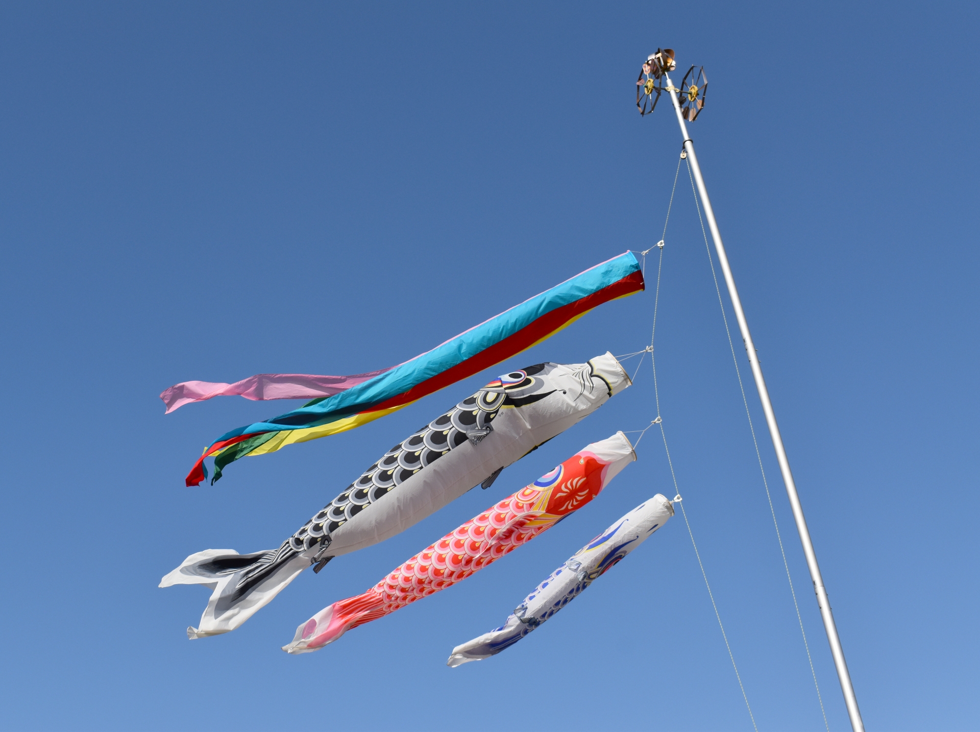 赤は緋鯉、黒は真鯉を竿に吹流し、矢車をとりつける。五月空に泳ぐ姿は雄大、男子の成長願う。