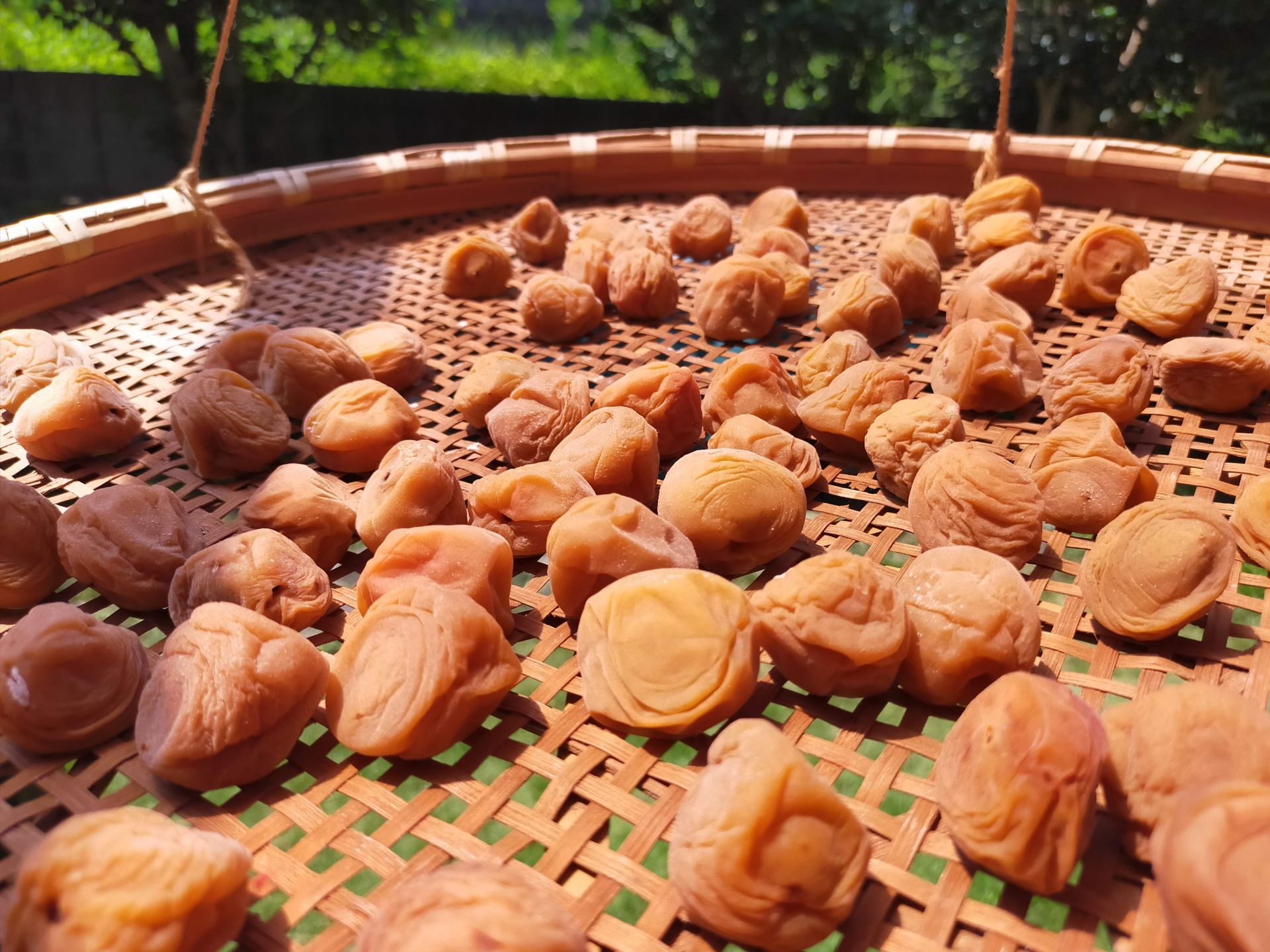 梅干には黄色く、熱した梅を用いる。へたを竹串で取り塩漬とし、数日後汁が上るこれが「梅酢」である。梅を取り出し笊にならべ日に干す。赤紫蘇は塩揉みし絞って「梅酢」に梅と共に入れる。再びあげて土用中に三日三晩干す、これを土用干という。