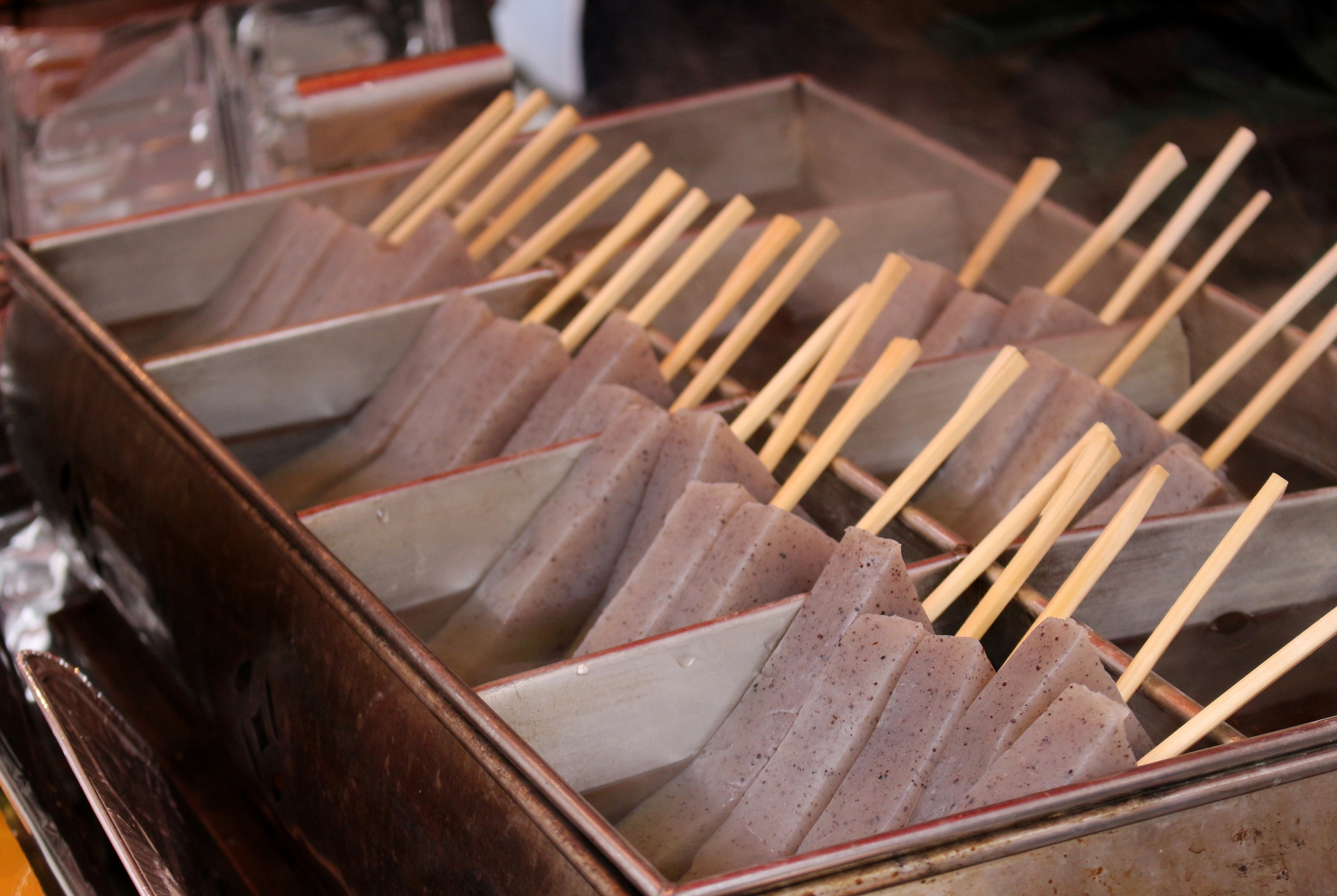 本葛を水で溶いて堅めに練り、箱に流す。冷して三角形に切り、黄粉と黒蜜をかけて食す。「葛切り」はうどんのように切ったもの。黄粉と黒蜜で食す。夏向きの菓子。