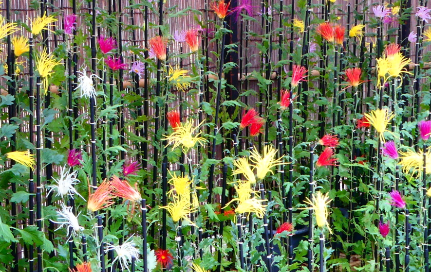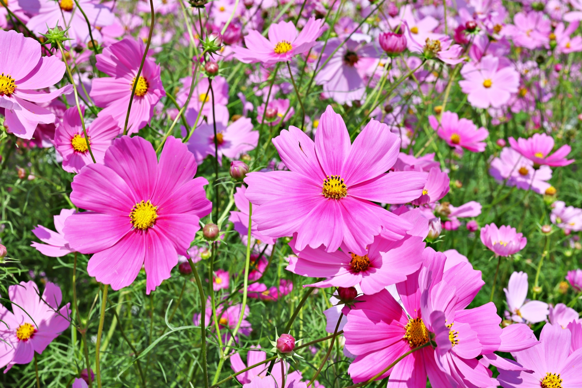 メキシコ原産。葉は細く、茎はヒョロヒョロで長い。花は白色、淡紅、深紅など。「川原」でのみだれ咲きはみごと。 秋桜 。