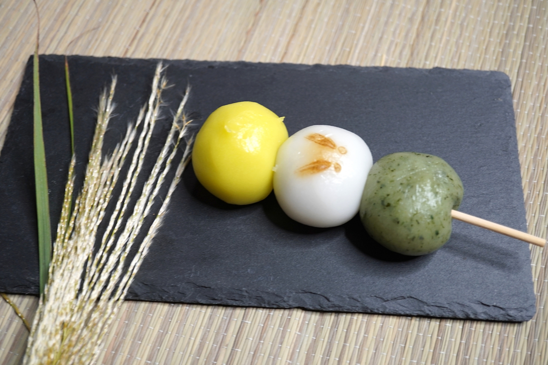 陰暦八月十五日の月、縁側の机上には、稲穂に見立てた芒を壺に入れ、三宝に秋の収穫物、里芋・さつま芋、上新粉で作った団子を十五ケ(後の月は十三ケ)供える。