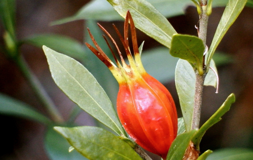 アカネ科クチナシ属の常緑低木。東アジアに分布。わが国では静岡県以西から南西諸島の山野に自生。6月〜7月に芳香のある白い花。晩秋に黄熟し、冬期に乾燥し保存。果実は裂けないので「クチナシ」の名がつく。料理には 金屯 の着色料。花はホワイトリカーに漬け「花酒」。染料は天平時代より布を染めたり、薬用にも使用。
