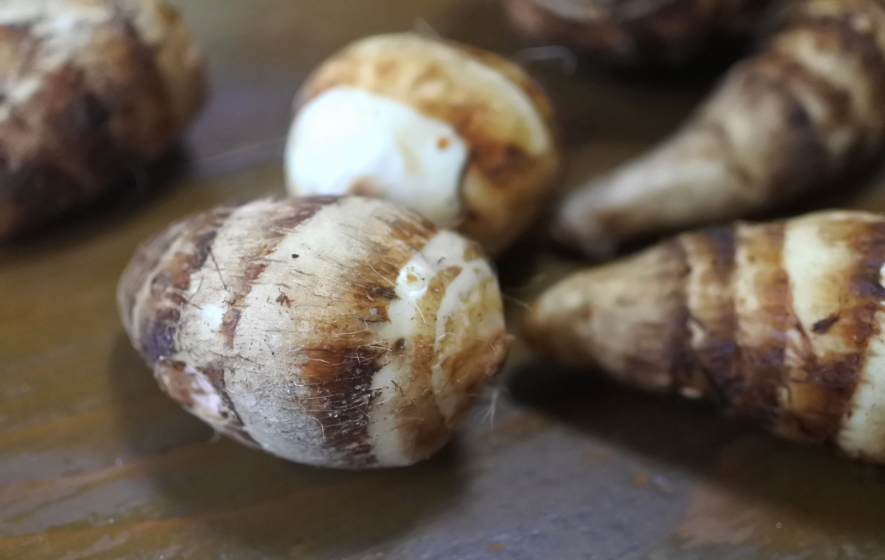 サトイモ科サトイモ属の多年草。「海老芋」は「里芋」の変種で「 唐 芋 」の品種。江戸時代中期安永年間(1772年〜81年)に、 青 蓮院 宮が長崎から持ち帰った唐芋を、平野権太夫が栽培して作り上げる。湾曲や表面の横縞が海老に似ているので「海老芋」の名が付く。親芋に子芋・孫芋が付き、子芋を「海老芋」という。味は粘り気に富み、優れた風味。収穫は10月〜11月。京都の伝統野菜。旬は11月〜2月。