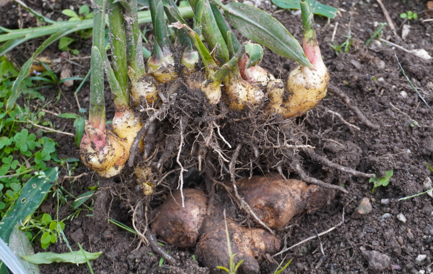 ショウガ科ショウガ属の多年草。生姜の別名「 ( はじかみ ) 」。原産地は熱帯アジア。香辛料や薬用として利用。「新生姜」は春の根付け5ヶ月後。皮は白く 塊茎 ( かいけい ) の茎元が薄いピンク色。皮に筋がなく、やわらかく香り辛みが強く、夏の味覚の香辛料として、素麺やお造り。旬は7月〜8月。6月頃より出回る。