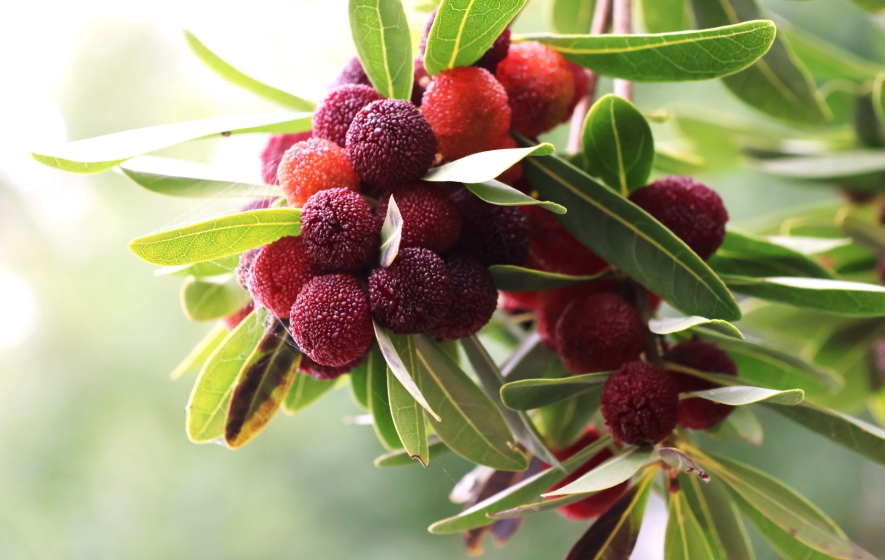 ヤマモモ科ヤマモモ属常緑樹。原産は日本及び中国。名は山に生え、実が食べられるのでこの名がある。分布 中部から・四国・九州・沖縄。雌雄異株で、3月〜4月花が咲き、6月〜7月に暗紅紫色の実が付く。傷みやすく関東以北の人には、口に入らない。収穫は6月〜7月。