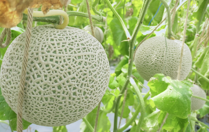 ウリ科一年生蔓草。日本のメロンはヨーロッパ型のネットメロンが主。1929年(大正14年)、ガラス・温室栽培が静岡県に導入、全国に広まる。栽培(入念な温度管理)は非常に難しい。特徴 果皮は網目、果肉は緑色。
