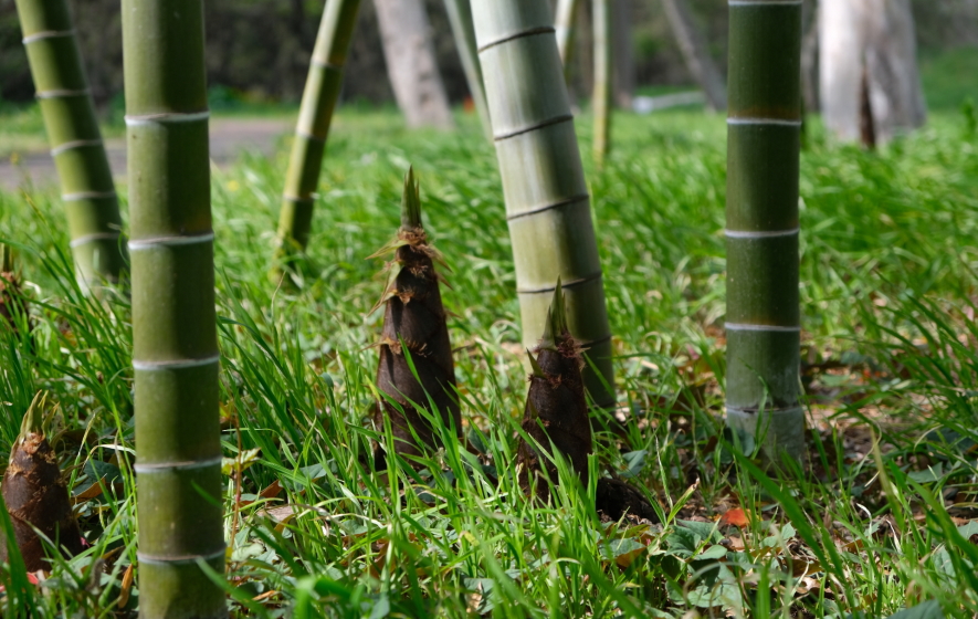 イネ科マダケ属。孟宗竹の原産は中国江南。渡来は16世紀中頃、江南から琉球王国へ、その後薩摩へ。江戸時代初期17世紀中頃薩摩から大阪・京都に渡り、全国に広まる。今では北海道を除く青森以南から沖縄まで分布。筍は地下茎から出る若い芽のことで、孟宗竹は大型で肉厚で柔らかく、 灰汁 が少なく、香りが高い。朝掘りは特に美味。生で食べられる。京都の筍は 乙訓 郡(向日市・長岡京市)の産で白子筍が有名。※筍は「夏の季語」で春に生え出るのを「春の筍」として区別。孟宗竹の旬は3月〜4月。