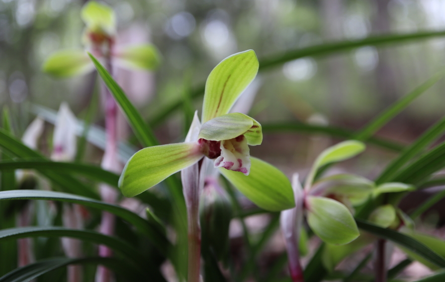 ラン科シュンラン属の常緑多年草。日本原産で中国春蘭は別種。北海道から九州まで日本各地の日当たりの良い山路に自生。3月〜4月にかけ花茎を出し、その先端に淡い黄緑色の一輪の可憐な花は気品が高い。